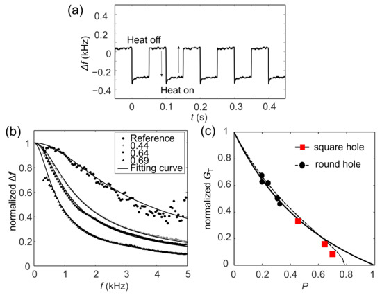 The MEMS beam resonators were driven in self-oscillation mode by using the PLL for fast frequency modulation, as reported in our previous works [18,24]. When the 530 nm laser was switched on, light was absorbed by the MEMS beam and it was heated owing to the photothermal effect, which reduced its resonance frequency. Figure 4a shows the shift in resonance frequency (Δf) when the laser was periodically modulated. Δf was measured as a function of the modulation frequency of the laser by using a lock-in amplifier, as shown in Figure 4b. The solid dots and the plus, square, and triangle signs represent the normalized values of Δf of the reference beam, as well as beams with P values of 0.44, 0.64, and 0.69, respectively. It is notable that the effect of the PLL was eliminated by normalizing all the data with the frequency response curve of the PLL. The reference MEMS beam without holes had the highest bandwidth (−3 dB: ~2 kHz), and the bandwidth decreased with an increase in P.