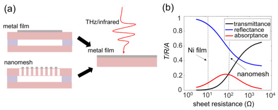 Although the porous nanomesh structure has adequate mechanical and thermal properties, as shown in Section 2 and Section 3, there is concern regarding its coefficient of optical absorptance. This is because the removal of materials to form a nanomesh structure significantly reduces the surface area for light absorptance, as schematically shown in Figure 5a. However, because the featured size of the nanomesh, i.e., the size of the hole (~1 μm), is much smaller than the wavelengths of THz electromagnetic waves (300 μm for 1 THz), we expect the nanomesh structure to have the same, high THz absorptance using a simple metal film [29].