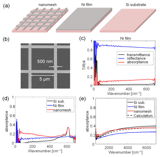 Figure 6e plots the absorptions of light by the substrate, Ni film, and nanomesh samples in the middle-infrared band (1000–7000 cm−1), represented by the black, blue, and red solid curves, respectively. The black dashed curve in Figure 6e plots the combined absorption, obtained by using Equation (4). The measured infrared absorption of the nanomesh structure gradually converged to the calculated Amesh at ~5000 cm−1. This is because at 5500 cm−1, the wavelength of light in the Si substrate decreased to 500 nm, which was identical to the width of the metal lines in the fabricated nanomesh structure.
