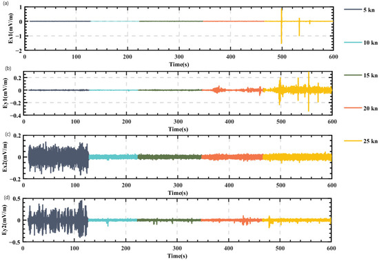 - Electric field noise signals were mainly composed of alternating components. The noise signals at the bow had the largest alternating components at v = 25 kn, whereas those at the stern had the smallest alternating components at v = 15 kn