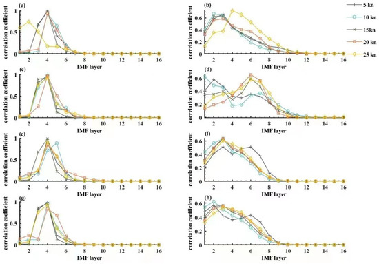 Correlation coefficients of IMF with and without targets as a function of decomposition layers.(a) Correlation coefficients for Ex1 at the bow; (b) Correlation coefficients for Ex1 at the stern; (c) Correlation coefficients for Ey1 at the bow; (d) Correlation coefficients for Ey1 at the stern; (e) Correlation coefficients for Ex2 at the bow; (f) Correlation coefficients for Ex2 at the stern; (g) Correlation coefficients for Ey2 at the bow; (h) Correlation coefficients for Ey2 at the stern.