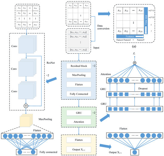 First, the data are stitched into a grid along the time axis, as shown in Figure 1a, where N is the number of features, T is the length of the time step, which is in units of h, t denotes the current moment. Since the prediction method in this paper is to use the previous T steps (t − (T − 1), t − (T − 2), …, t) to predict the drift value at the next moment (t + 1), so the grid is converted into a matrix and fed into the model, and the local features are extracted through the ResNet layer. Then, the output of the ResNet layer is sent to the fully connected layer, which aims to adjust the size of the output vector and enhance the nonlinear mapping capability of the model. Next, superposing of two GRU layers is used to capture the change trend of the sequence and learn higher-level time-domain feature representations, and the output of its fully connected layer is fed to the first GRU layer. The hidden states of the second GRU layer are then used as input to the attention layer, which is used to learn the importance of each hidden state. Finally, the output of the attention layer is flattened and then connected to the output layer.