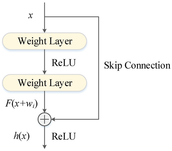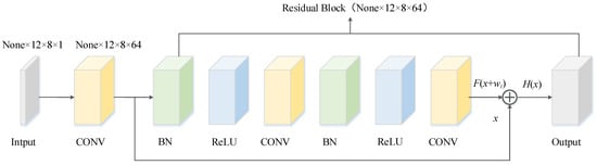 Considering that the multi-functional buoy dataset is converted to a grid along the time axis and can be considered a single-channel image, CNN is used as a network component to improve the drift prediction accuracy. Previous studies have shown that deepening the number of network layers can extract richer features [32]. However, deeper networks are not always ideal, owing to the tendency of backpropagation to produce vanishing or exploding gradients [33]. Therefore, in 2015, Kaiming He et al. [34] proposed ResNet containing “skip connections”, which is composed of multiple stacked residual blocks, as shown in Figure 2. The computational procedure is: