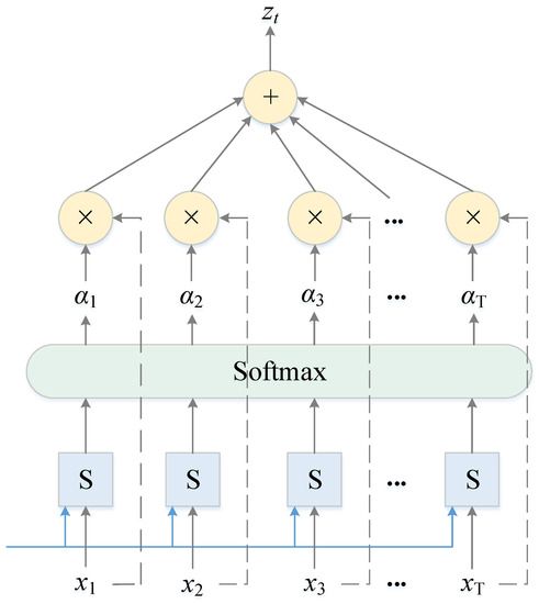 The attention layer can be simply described as weighted summation, which first calculates the matching degree between each hidden state of the input by using a scoring function S and inputs the matching degree score into the softmax function to obtain the attention weights. Then, the weights and the input features are multiplied correspondingly, and finally, they are summed to obtain the output. The calculation process can be described as [37]: