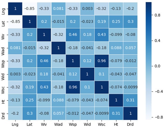 After data cleaning, the Pearson correlation coefficient R was used to assess the strength of the correlations among the eight hydrometeorological varaibles (Lng, Lat, Wv, Wad, Wsp, Wid, Wsc and Ht) and the multi-functional buoy drift value (Drd), and the results are shown in Figure 7, where the larger the value of |R|, the higher the degree of correlation.