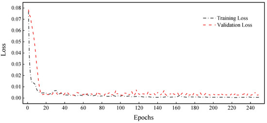 To determine the optimal model hyperparameters, the model was trained several times. During the process of training, the early stopping method was adopted to preserve the optimal weights and avoid overfitting so as to obtain better generalization performance. Among them, MSE was used as the loss function, Adam was utilized as the optimizer, the learning rate was 0.0001, and the batch size and epoch were set to 256 and 250, respectively. In addition, the larger the time step, the longer the training time and the greater the noise; hence, the time step was set to 12.
