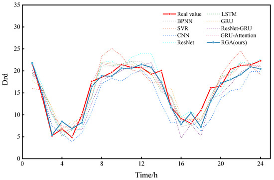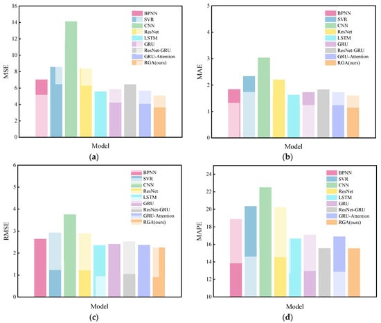 The RGA model was compared with the eight models mentioned in Section 4.4, and the results are shown in Table 5 and Figure 9, from which it can be seen that most of the deep learning (DL) models outperform the traditional machine learning (ML) models, while the proposed RGA model has the best performance. The model reduces the MSE, MAE, RMSE and MAPE metrics by 21.1%, 12.5%, 11.2% and 0.03%, respectively, compared to the ResNet-GRU model and by 10.1%, 7.1%, 5.2% and 7.9%, respectively, compared to the GRU-Attention model. Similarly, the performance of the GRU-Attention model is better than that of the GRU model, which fully shows the success of introducing the attention mechanism into the model, as it assigns different weights to each hidden state by calculating the attention score and effectively extracts useful information.