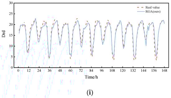 Comparison between RGA model and other models (a week). (a) BPNN; (b) SVR; (c) CNN; (d) ResNet; (e) LSTM; (f) GRU; (g) ResNet-GRU; (h) GRU-Attention; (i) RGA(ours).