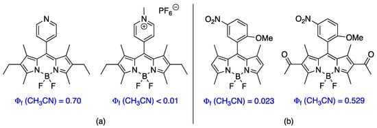 Previous work on modulating the fluorescent properties of BODIPY dyes: (a) effect of N-methylation of a meso-(4-pyridyl)-BODIPY [32], and (b) effect of introduction of acetyl groups at the 2,6-positions of a meso-aryl-BODIPY [34].