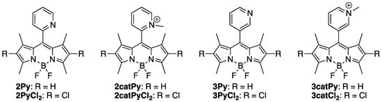 Chlorination of BODIPYs 2Py and 3Py using TCCA in dichloromethane [33] produced the corresponding 2,6-dichloro derivatives 2PyCl2 and 3PyCl2 in 84% and 89% yields, respectively. Methylation of these 2,6-dichloro-BODIPYs using methyl iodide afforded their pyridinium derivatives 2catPyCl2 and 3catPyCl2. Anion exchange was performed on these BODIPYs using ammonium hexafluorophosphate. The structures of all the BODIPYs were confirmed by 1H, 13C and 11B NMR (see Supplementary Materials, Figures S3–S26) and by high-resolution mass spectrometry (ESI-TOF).