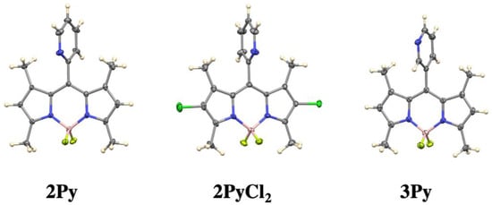 Crystals of 2Py, 3Py and 2PyCl2 were obtained by slow evaporation of dichloromethane and pentane, and the results are shown in Figure 4. BODIPYs 2Py, 3Py, and 2PyCl2 all have their 12-atom BODIPY cores nearly planar, with mean deviations from coplanarity of 0.029, 0.023 and 0.038 Å, respectively. The dihedral angles between the BODIPY core planes and the pyridyl planes are also similar, 79.3° for 2Py, 82.3° for 3Py (average of two independent molecules), and 85.9° for 2PyCl2. These values agree well with those for the published structure of 4Py [36,38,39], for which the mean deviation from the BODIPY core is 0.018 Å and the BODIPY/Py dihedral angle is 83.9° (average of two). Bond distances and angles also show excellent agreement across the three structures and in agreement with the published structure of 3Py [36]. The relatively lower dihedral angle observed for 2Py relative to the 3Py and 4Py suggests a slight increased flexibility for 2Py, although the difference is very small. Therefore, for all three isomers the pyridine is interlocked between the 1,7-methyl substituents and does not affect the molecular structure of the BODIPY core.