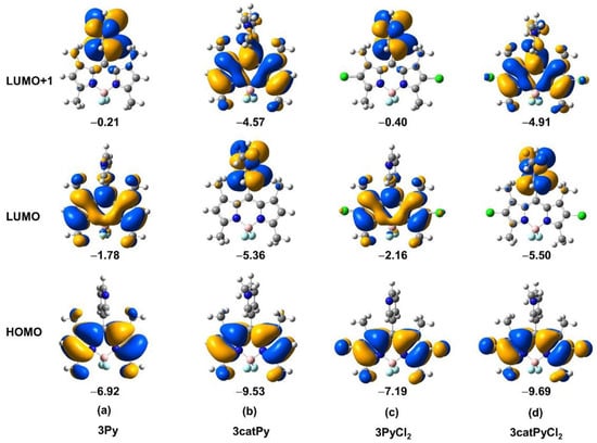 Frontier orbitals of (a) 3Py, (b) 3catPy, (c) 3PyCl2 and (d) 3catPyCl2 BODIPYs. Orbital energies in eV. The frontier orbitals for the entire series are given in Appendix A.