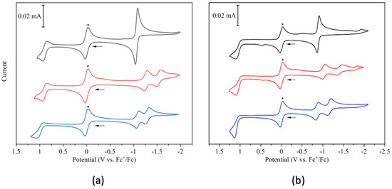 Cyclic voltammograms at 100 mV/s on platinum electrodes of 1 mM solutions of (a) 2catPy (blue), 3catPy (red), and 4catPy (black) and (b) 2catPyCl2 (blue), 3catPyCl2 (red), and 4catPyCl2 (black), in degassed, anhydrous acetonitrile with 0.25 M NBu4PF6 supporting electrolyte. Arrows indicate the direction of the potential scan. The wave marked with an asterisk (*) at 0 V vs. Fc+/Fc corresponds to the internal Fc standard.