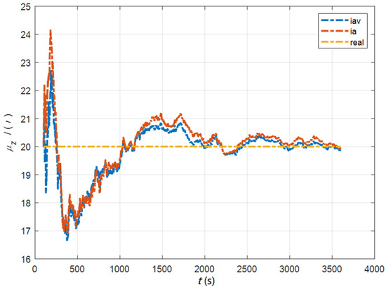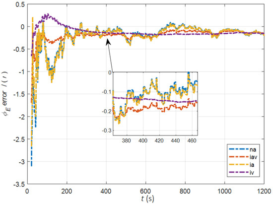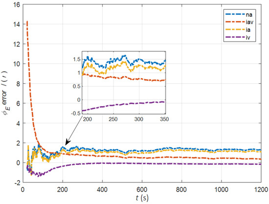 The data in Table 1 are the root mean square error (RMSE) values of from 200 to 1200 s for different initial alignment algorithms. In the cases of the initial misalignment angles , the attitude and velocity matching algorithm in the ECI frame (iav) has the fastest alignment speed, the best stability, and the highest accuracy. Its initial alignment accuracy is better than 0.3′, in particular, the RMSE of the north alignment is 0.11′, which is obviously better than other algorithms. This is because the velocity measurement information further improves the observability of the misalignment angle, and effectively inhibits the influence of hull deformation on the accuracy of the initial alignment. The alignment speed and accuracy of the attitude matching algorithm in the navigation frame (na) and attitude matching algorithm in the ECI frame (ia) are similar. The horizontal alignment accuracy of the traditional velocity matching algorithm in the ECI frame (iv) is equivalent to that of other algorithms, but the RMSE of the azimuth misalignment angle reached 4.07′, which is obviously inferior to other algorithms.