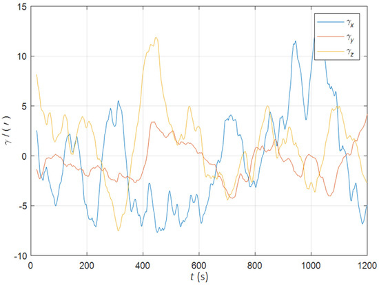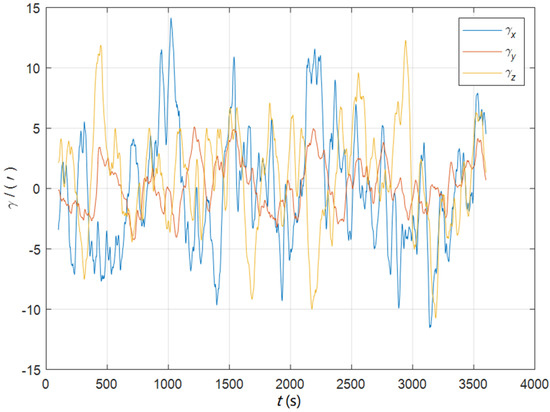 Initial position: , . Initial attitude: . Swinging angular amplitudes (pitch, roll, yaw): . Swinging angular periods: 12 s, 10 s, and 15 s. Inertial device performance of the SINS: gyro drift , random walk , accelerometer bias , random noise . The static deformation angle : . The mean square error of the dynamic deflection angle: . The triaxial correlation times: 60 s, 60 s, 60 s. The curves of the dynamic deflection angle are shown as Figure 2.