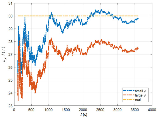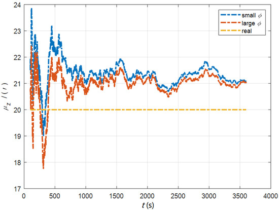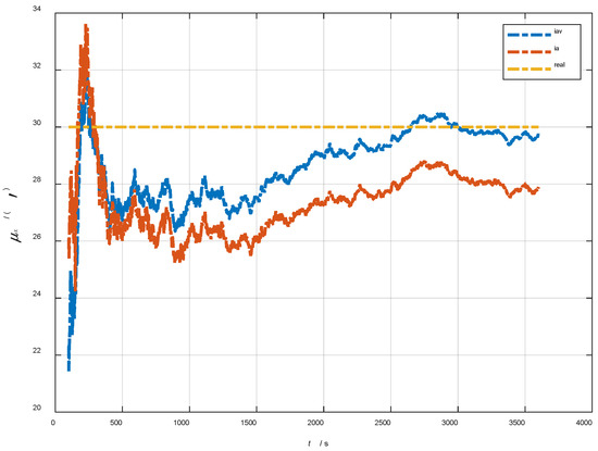 The data in Table 3 are the RMSE values of in 200–1200 s under two initial misalignment angles. As can be seen from the above figures and tables, the estimated errors of the triaxial misalignment angle have converged rapidly since 200 s. In the cases of the initial misalignment angles , the estimation accuracy of the horizontal misalignment angle is better than 0.2′, and that of the azimuth misalignment angle is better than 0.3′. In the cases of the initial misalignment angles , the estimated accuracy of is better than 1.3′, the estimated accuracy of is better than 0.4′, and the estimated accuracy of is better than 0.7′.