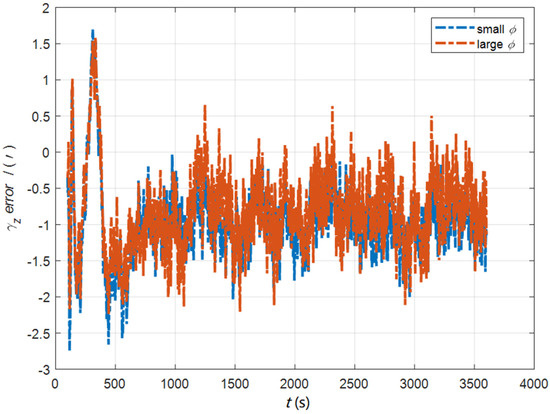 In the case of large and small initial misalignment angles, the error curves of are shown in Figure 10 and Figure 11.