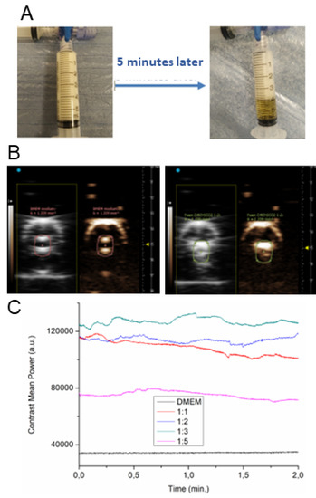 In vitro evaluation of CO2 foam. (A) CO2 foam prepared by mixing DMEM&FBS medium and carbon dioxide (1:2) immediately after preparation (left picture) and 5 min later (right). (B) NLC imaging of CO2 foam in phantoms. US (left) and NLC phantom imaging (right) of DMEM&FBS medium (left panel) and DMEM&FBS:CO2 1:2 v/v foam (right panel). (C) Contrast signal obtained from pure DMEM&FBS medium and different DMEM&FBS:CO2 ratios.