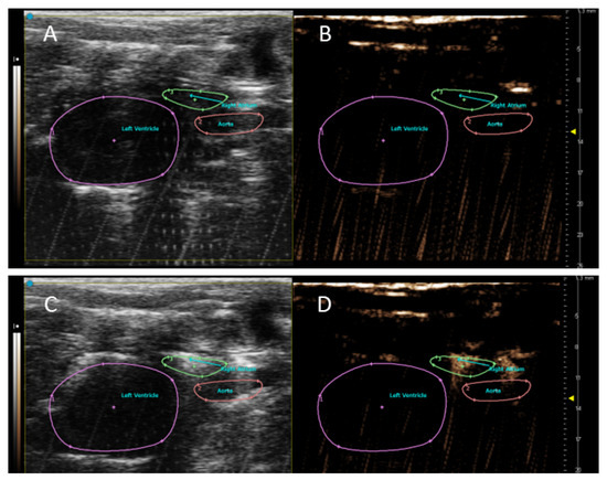 The intravenous application of 2 mL of CO2 foam (n = 3) and 220 µL of Vevo MicroMarkerTM microbubble contrast (n = 3) as contrast agents into the rat tail vein led to an increase in the NLC signal in the right atrium, left ventricle and the aorta immediately after the contrast agent’s administration (see Figure 2) in all six experimental rats.