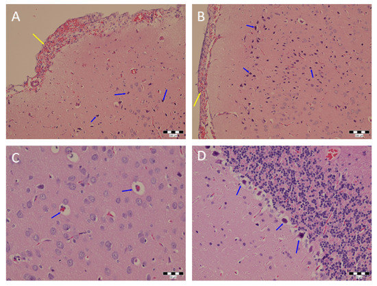 Histological analysis of brain tissue stained with hematoxylin and eosin. Hemorrhage in the meninges of the hemisphere (yellow arrow). Some of the dark neurons in the cortex are indicated with blue arrows (A). Hyperemia and hemorrhage in the meninges of the cerebral hemisphere (yellow arrow). Some of the dark neurons in the cortex are indicated with blue arrows (B). Pericapillary edema in the cortex of the hemisphere (blue arrows) (C). Dark neurons in the Purkinje cell zone in the cerebellum. Some of them are marked with blue arrows (D). Scale bar 100 µm.
