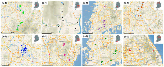 Study area with topsoil samples’ locations (the alphabet means the four major rivers in the Republic of Korea: (a) Geum River, (b) Nakdong River, (c) Yeongsan/Seomjin River, and (d) Han River. The waterfront area and drinking water protection zone are represented by (1) and (2) respectively).