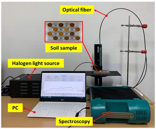 The topsoil sample was placed in a 6 × 4 well multi-dish with a radius of 15.85 mm at a thickness of 15.5 mm to measure the reflection spectrum of the topsoil. After removing gaps between particles by applying a constant pressure, the topsoil sample was flattened to obtain a smooth surface, and a total of three sets were composed. The experimental configuration for the spectroscopic experiment is shown in Figure 3. The experiment carried out in a dark room to minimize noise and error of the spectrum during spectral measuring. Furthermore, the distance between the spectroscopic probe and the topsoil sample surface was fixed at 4 mm and a 45° zenith angle. A 100 W tungsten halogen lamp (ASBN-W, Korea spectral products, Seoul, Republic of Korea) was used as a light source and optical fiber was connected to uniformly irradiate the sample surface with incident energy. The reflectance spectra of topsoil samples were obtained using a spectroradiometer (Fieldspec4, ASD Inc., Alpharetta, GA, USA) at a wavelength of 350 to 2500 nm with a spectral resolution of 3 nm at 700 nm and 10 nm at 1400 and 2100 nm. The spectroradiometer has a bandwidth of 1.4 nm at 350 to 1000 nm and 1.1 nm at 1001 to 2500 nm. Spectra were acquired under the condition of an exposure time of 136 ms and recorded with a sampling resolution of 1 nm to obtain reflectance of 2151 wavelength. The spectra reflectance of each topsoil sample was measured after scanning each sample ten times. For each topsoil sample, measurements were repeated three times, and 414 spectral data were obtained from one set of topsoil samples. The reflectance of the topsoil samples was adjusted by using dark and white references to correct the device noise. The reflectance of the dark reference was obtained without a light source and the white reference used diffused reflectance standards (Labsphere, North Sutton, NH, USA).