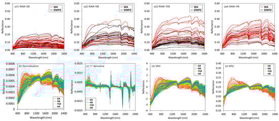 (a) Raw reflection spectrum of topsoil samples in (a1) Geum River, (a2) Nakdong River, (a3) Yeongsan/Seomjin River, and (a4) Han River and reflection spectrum with applied main pre-processing ((b) maximum normalization, (c) 1st derivative, (d) SNV, and (e) MSC).