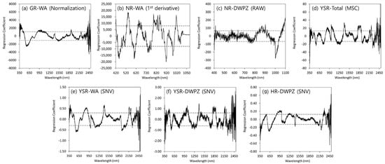 Plots of the regression coefficient with the PLSR models for SOM predictions in (a) WA of GR, (b) WA of NR, (c) DWPZ of NR, (d) total of YSR, (e) WA of YSR, (f) DWPZ of YSR, and (g) DWPZ of HR.