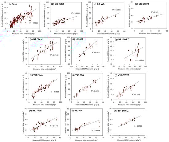 The developed optimal SOM prediction model for each of the four major rivers was verified using an unknown topsoil sample as a prediction dataset (Figure 6). For the optimal model of total topsoil (SVR with 1st derivative pre-processing), the R2 value was higher than Rv2 (R2 = 0.706). Furthermore, as the SOM content increased, the distribution of SOM prediction tended to expand (Figure 6a). The R2 value of the SOM prediction model in GR ranged between 0.486 to 0.624 (Figure 6b–d). Among them, the model in DWPZ gave an R2 value after validation of 0.565, which was lower than Rv2 (0.735). Overall, the SOM prediction model in GR appears to have a low performance because of weak reflectance due to the overlapping of various components in the topsoil. The prediction R2 of the model in NR reached a range of 0.351 to 0.803 (Figure 6e–g). The performance of the model in DWPZ was rather low, at 0.351. The average SOM content of the DWPZ of NR was 61.80 g kg−1, and the higher the SOM content in the model verification of the total topsoil (Figure 6a), the wider the predictive distribution and the lower the performance. Therefore, it was judged that the R2 value was low owing to the high SOM content in DWPZ of NR. The R2 of the SOM prediction model in YSR and HR was found to be similar or higher value than that of the Rv2 value (Figure 6h–m).