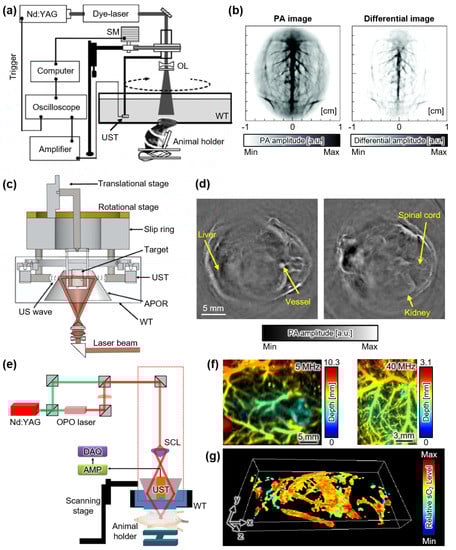 PAI systems with single-element USTs. (a) Schematic of PAI system with circular scanning of a single-element UST. (b) Contrast-enhanced PA and differential images of the brain of a rat with an injection of contrast agent. (c) Schematic of PAI system with a slip-ring-based rotational scanning using multiple USTs. (d) PA images of abdomen region of mice in vivo. (e) Schematic of PAI system with raster scanning using a single-element UST. (f) PA images with two different UST center frequencies. (g) Volumetric SaO2 whole-body distribution in mice in vivo. PA, photoacoustic; PAI, photoacoustic imaging; UST, ultrasound transducer; SaO2, hemoglobin oxygen saturation; SM, step motor; OL, optical lens; WT, water tank; APOR, acoustically penetrable optical reflector; AMP, amplifier; DAQ, data acquisition module; SCL, spherical conical lens. The images are reproduced with permission from refs. [23,25,26,27].