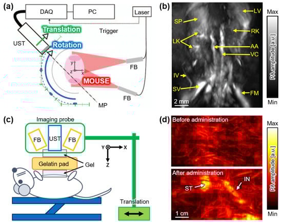 PAI systems with linear array USTs. (a) Schematic of PAI system with a combination of translational and rotational scans using a linear array UST. (b) Representative PA image of abdomen area of a mouse in vivo. (c) Schematic of PAI system with a simple translational scan using a linear array UST. (d) PA images of abdomen area of a rat in vivo before and after oral administration of exogenous contrast agents. PA, photoacoustic; PAI, photoacoustic imaging; UST, ultrasound transducer; FB, fiber bundle; DAQ, data acquisition module; SP, spleen; LV, liver; LK, left kidney; RK, right kidney; AA, abdominal aorta; VC, vena cava; IV, ischiatic vein; SV, saphenous vein; FM, femur; ST, stomach; IN, intestine. The images are reproduced with permission from refs. [33,39].