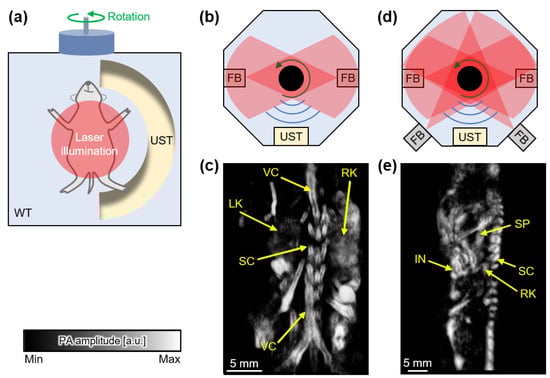 PAI systems with curved array USTs. (a) Schematic of PAI system with a rotational scan using a curved array UST. (b) Schematic of light illumination and PA wave acquisition in the initial configuration. (c) Volumetric PA whole-body image of mice in vivo. (d) Schematic of light illumination and PA wave acquisition in the updated system. (e) PA whole-body images of a mouse in vivo with the additional light illuminating FBs. PA, photoacoustic; PAI, photoacoustic imaging; UST, ultrasound transducer; FB, fiber bundle; VC, vena cava; LK, left kidney; RK, right kidney; SC, spinal cord; SP, spleen; IN, intestine. The images are reproduced with permission from refs. [44,46].