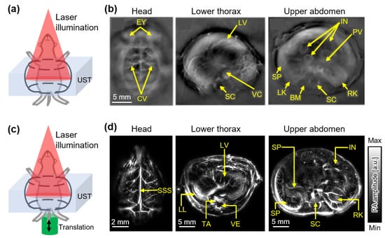 - Park, E.-Y.; Park, S.; Lee, H.; Kang, M.; Kim, C.; Kim, J. Simultaneous Dual-Modal Multispectral Photoacoustic and Ultrasound Macroscopy for Three-Dimensional Whole-Body Imaging of Small Animals. Photonics 2021, 8, 13. [Google Scholar] [CrossRef]