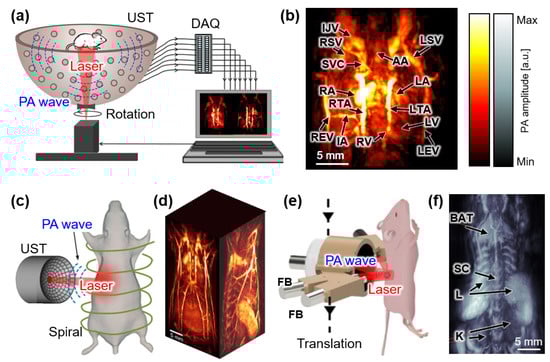 In this review, we discussed PAI systems used for whole-body imaging of small animals with respect to the geometries of US transducers, i.e., single-element, linear array, curved array, and spherical array transducers (Table 1). Depending on the transducer type, appropriate scanning mechanisms (typically linear translational scanning or rotational scanning) were used to obtain volumetric images of small animals in vivo.