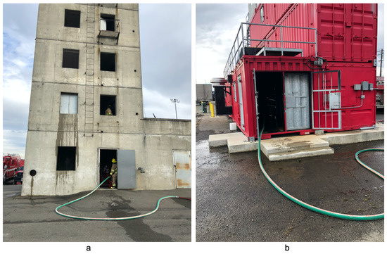 To do this, we collaborated with the local fire department at their training facility where they train new recruits as well as hold live fire response exercises. One of these buildings was a solid concrete, five story tower as shown in Figure 4. The second building was composed of multiple stacked corrugated metal shipping containers shown in Figure 4.