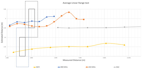 The limited accuracy of ranging at increased distances can lead to position uncertainty. For localization, because we must combine multiple ranges to calculate a position, ranging precision between devices must be consistent to realize accurate positioning within a given precision target. Given this, we also analyzed the linear ranging results for precision at one meter (minimum precision requirement) and 0.5 m (preferred precision requirement). Figure 5 includes three windows that highlight the distances at which our estimated distances met these precision requirements. The boxes with dotted lines show the experiments where we observed one meter precision and the boxes with the solid lines show when ranging precision was within 0.5 m. It should be noted that BLE, shown as the gray points in Figure 5 did not meet our precision requirements at any distance. For Wi-Fi, when the devices were closer than three meters, our precision requirements were met. However, precision was unacceptably lower greater beyond three meters. Both 915 MHz and 433 MHz met our one meter precision requirement between 2.5 and 3.5 m from the anchor, and met the 0.5 m precision requirement between 2.75 and 3.25 m. This means that when multiple ranges are used to determine position, to maximize location precision, anchors should be located within the window of precision from the tag at any time. However, given many spaces this may not be practical.