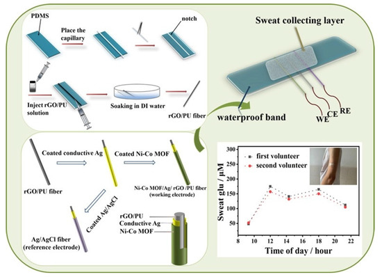 Fabrication and application of the Ni–Co MOF/Ag/rGO/PU fibre-based electrodes for the real-time monitoring of glucose molecules [127].