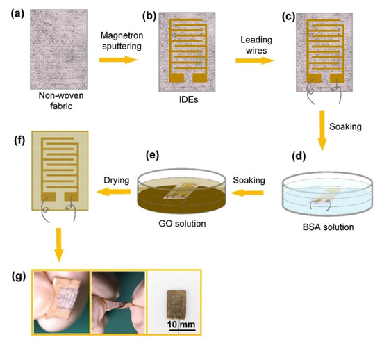 Representation of the fabrication steps of the GO/non-woven fabric-based sensors for respiratory applications. (a) The non-woven fabric taken as the processed material was used as substrates to form (b) interdigitated electrodes (IDEs) and (c) attach connecting wires. (d) The samples were then treated with (d) bovine serum albumin (BSA) solution and (e) graphene oxide (GO) solution. (f) The samples were then dried and used for experimental purposes. (g) The mechanical flexibility and final dimension of the sensors [134].