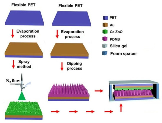 Jiang et al. [136] reported interesting work highlighting the development of integrated flexible, self-powered, and wearable respiration sensors. The triboelectric sensors contained a specific amount of doped Cerium (III). Figure 5 [136] demonstrates the fabrication steps of these triboelectric, wearable respiration sensors. The sensors were formed using PET polymers and gold nanoparticles to form the polymers and electrodes, respectively. Zinc oxide (ZnO) nanocomposites were formed by doping with cerium at different ratios from 0–0.01 M. The final optimized Ce-doped value of the ZnO nanocomposites was 0.004 M. PDMS was used as the triboelectric layer and was modified using the template method. The two layers, Ce-doped ZnO and PDMS, were affixed using two soft silica gel films with 100 µm thickness. The final step included packing the device using a flexible sealing film to generate a total thickness of 3 mm. Some of the primary attributes of these prototypes were their high selectivity and high sensitivity of 20.13 ppm−1. After the sensors were triggered by the expansion and contraction of the chest during the breathing process, these sensors could simultaneously detect the human respiratory patterns and physiological processes after intensive motions.