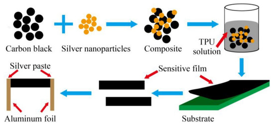 Schematic illustration of the fabrication process of the carbon black/silver nanoparticles/ thermoplastic PU nanocomposites-based strain sensors [138].