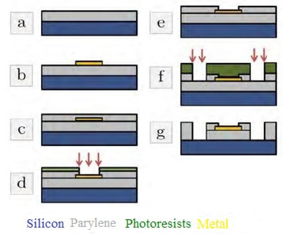 Schematic diagram of the fabrication process of the Parylene C/PEDOT-based neural sensors. (a) The deposition and annealing processes of Parlyene (b) Metallization and lift-off processes of the metallic layers were carried out. (c) Passivation process with Parylene C and annealing. (d) Passivation plasma etching process was carried out for electrode opening. Other processes like (e–g) plasma etching and photoresist stripping [149].