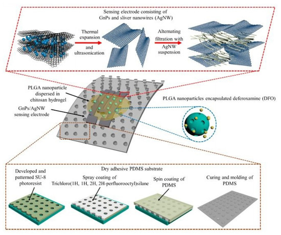 The nanocomposites have also been used to develop drug wearable -delivery sensors, as shown in [158]. Multifunctional prototypes were formed using nanocomposites that contained graphene and silver nanowires as conducting nanomaterials. These sensors were employed for highly sensitive-strain sensing and drug-delivery applications. A simple and cost-effective technique was used to develop the sensors with certain components, such as skin-mountable dry adhesive substrates, robust sensing elements, and a transdermal drug delivery system. Figure 9 [158] shows an illustration of these components. The substrates of these sensors were formed using PDMS micropillar arrays on five-inch silicon wafers. These PDMS arrays had a diameter of 10 µm and an aspect ratio of 3:1. The pull-off strength of these micropillar films was around 1 N/cm2. A filtration-patterning technique was used to process the nanocomposites to obtain a thickness of around 40 µm. Sandwich-structured geometry was formed on these nanocomposites on PVDF films. The effective sensing area was around 5 cm2, and was able to adhere to the silicon wafer and human arm. The drug-delivery mechanism comprised of polylactic-co-glycolic acid nanoparticles and a chitosan matrix. The nanoparticles were released into the stratum corneum up to a depth of 60 µm.