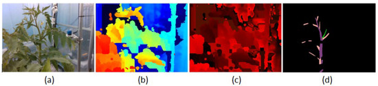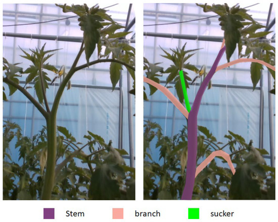 Tomato sucker pruning is an important activity, but there is no public research about how to remove tomato suckers automatically. Figure 1 shows an example of a tomato sucker which is green in the right image of Figure 1. A sucker is always between a stem and a branch. It should be cut off when it is small before it becomes a stem. Usually, farmers remove suckers from their experiences. In 2007, Ara et al.’s research [10] demonstrated that pruning affects not only yield but also fruit characters. Their experiments showed that tomato yield is much higher, tomato fruit width is larger, and tomato fruit wall is thicker with pruning. Pruning also has a positive affection on the disease and insect infestation of tomato plants [11]. Because of these benefits, we study this subject.