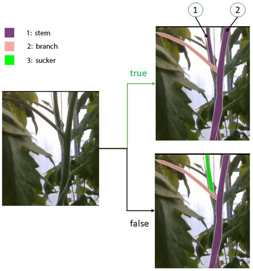 For training, evaluating, and comparing the proposed neural network with other networks, we made an RGB-D tomato dataset. Although RGB-D images gain a lot of attention in the recognition task of computer vision, they are mostly applied to indoor semantic segmentation research [24,25,26] or salient object detection research [27,28,29]. The interesting part of the research is how to fuse the feature of depth images and RGB images. Although the moment and the way fusion happens may be different, the processes that extract RGB and Depth image features are usually separate. Our research works on tomato plant parts which are very closed to each other. Leaves take an especially high appearance rate and cover the other tomato parts. The depth information is not that different between adjacent objects. We did some experiments using complete depth information and RGB images as inputs. Their results are not accurate. However, the depth information can help us to separate the close and the far tomato plants when they are captured in one image. Sometimes, in an RGB image, a stem crosses the other stem at its node like in the left image of Figure 2. In reality, stem 2 is further than stem 1 if we look from the camera. From the viewpoint of the 2D image, stem 1 is between a branch and stem 2. It is similar to a sucker and is often recognized as a sucker by many models. We want to use depth information to reduce this misunderstanding. The depth or the distance of a sucker to the camera is often similar to that of its stem. In the example of Figure 2, the depth of stem 1 is higher than the depth of stem 2. This information gives the network more data to recognize that stem 1 is not a sucker, and it helps the model distinguish a real sucker from other parts. Therefore, we propose a new method for fusion depth information. We do not use full-depth information. We only use the depth information for objects that models may have difficulty predicting.
