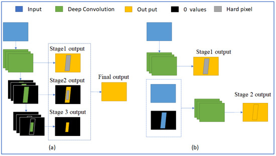 (a) is the deep LC structure, and (b) is our proposed multi-stage structure. The yellow region is the final output. The grey region is a hard region that is detected by comparing the pixel score of output to a threshold. The black region is the removed region of pixels having 0 value.