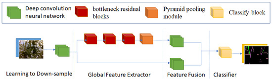 There are some problems when using Fast-SCNN with the tomato sucker dataset. Firstly, the resolution of images decreases by 16 times. This leads to the loss of a lot of information because the area of suckers is small compared with the whole image. That is why the result of Fast-SCNN in Section 5 is not good. If we decrease the down-sample rate, the execution time of the “Global Feature Extractor” increases considerably.
