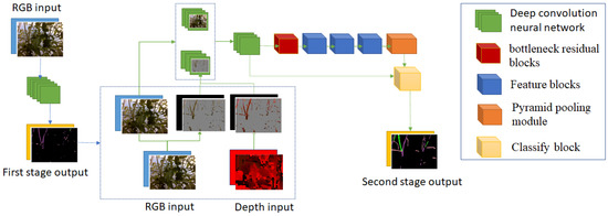 Stage 2 gets more information on hard pixels to produce better output. We use the function Premax to get the value of each pixel of output result at stage 1. A pixel with a value greater than t1 is called an easy pixel, and a pixel with a value less than t1 is called a hard pixel. The hard pixels should be getting more information. In our dataset, hard pixels are often the pixels of interest corresponding to the stems, suckers, and branches. In Figure 7, we can see that stage 1 output is not accurate, but it can detect hard pixels. After testing, we saw that t1 = 0.7 gives the best result. The inputs of this stage include normal RGB images, removed easy pixel RGB images, and removed easy pixel Depth images. They are concatenated with the rate 12: 16: 4 and pass through some convolutions before going through a Bottleneck block. Typically, the other network will reduce the resolution and apply more Bottleneck blocks. However, the branches and suckers in the images are thin. The down-sampling and up-sampling operations cause losing their information. Therefore, we propose three different Feature blocks to extract image features at this step. Feature_s1 and Feature_s2 are two convolution block extracts feature with different kernel sizes and different groups. Feature_d extracts feature with different dilation, kernel, and group size. As an alternative for using thousands of feature channels, we use the different combinations of kernel size, group size, and dilation size to get different characteristics of images. Finally, we use the Pyramid Pooling block to get global context, followed by a Classify block. The details of each block and structure of stage 2 are in Table 2, Table 3, Table 4, Table 5, Table 6 and Table 7. The output of this stage is the final output.