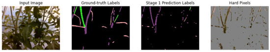 In our research, we need to know that each pixel in the image belongs to suckers, stems, branches, or others. Therefore, the images were labeled as four classes: stem, branch, sucker, and others, with values 1, 2, 3, and 0, respectively. We focused on how to detect suckers, branches, and stems because we can find the pruning point of the suckers from this information. We did not label the other parts of tomato plants, such as leaves and fruits. We did not detect them in our network. Figure 3 shows a visualized example of a ground-truth label image. Violet regions, pink regions, green regions, and black regions represent stems, branches, suckers, and other objects, respectively.