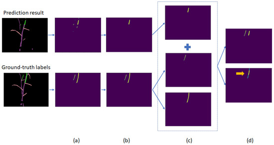 This method is used to evaluate the performance of semantic segmentation neural networks on tomato sucker detection in our experiment. It is an example of how tomato suckers are handled from the output of semantic segmentation neural networks.