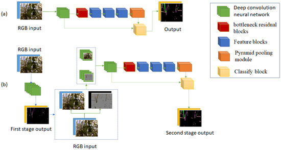 (a) is the structure of Version 1 which has one stage, and its input is only RGB images. (b) is the structure of Version 2 which has two stages, and their inputs are only RGB images.